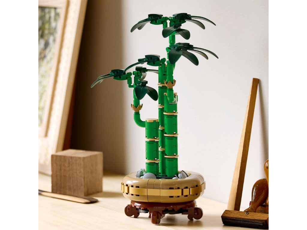 Stavebnice obsahuje tři bambusové stonky různých výšek se zelenými listy a decentním květináčem, který doplňuje celkový vzhled. Díky kompaktním rozměrům se Bambus štěstí hodí jako stylový doplněk do kanceláře, bytu nebo zenového koutku.