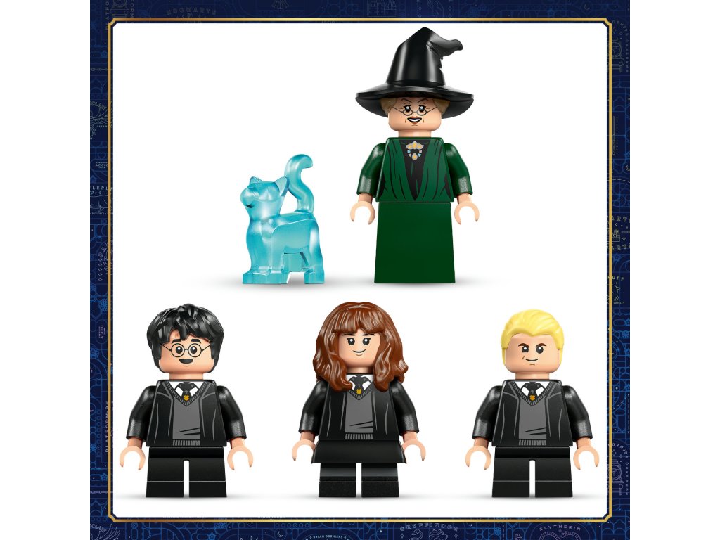 - Minifigurky studentů a učitelů: Autentické postavy pro interaktivní a kreativní hraní scén z Bradavic.