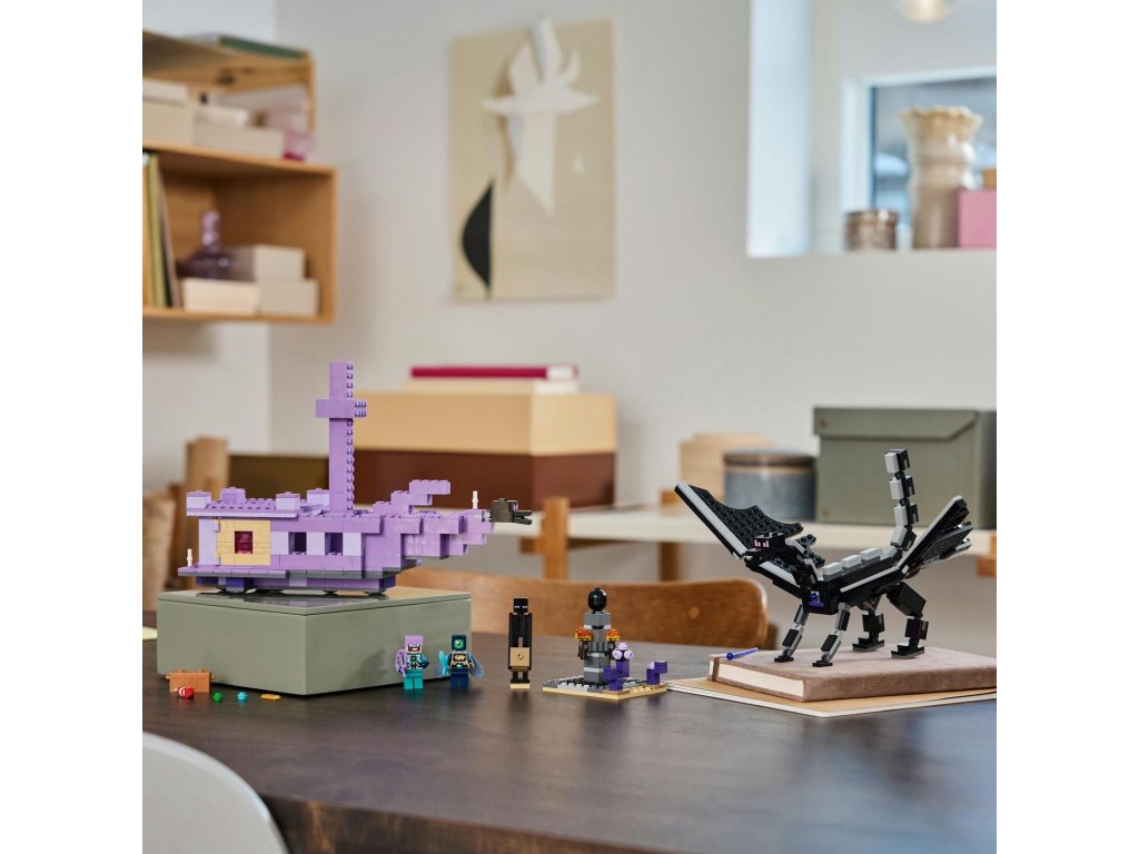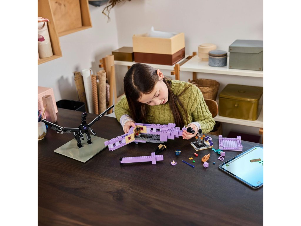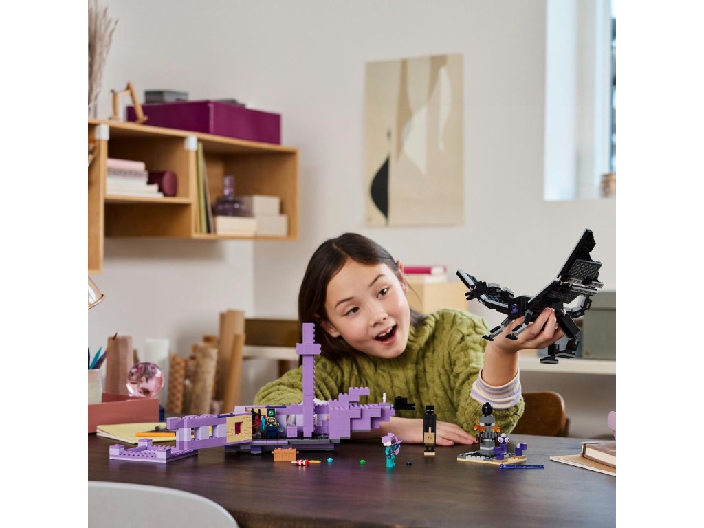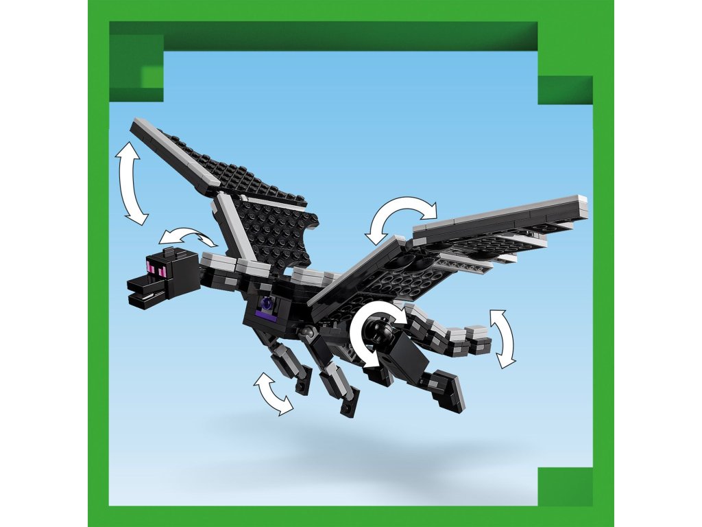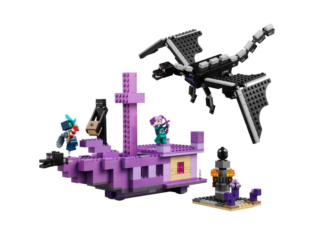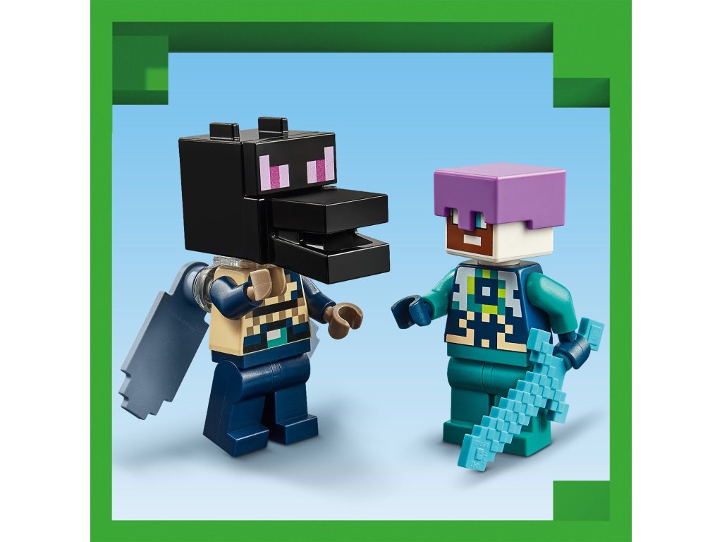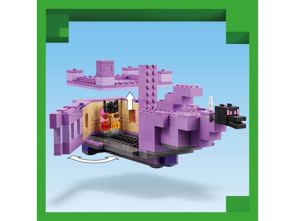 Vstupte do nebezpečného biomu End a postavte se legendárnímu drakovi z Enderu. Tato figurka má všechny klouby pohyblivé a lze je upravovat podle potřeby. Loď z Endu nabízí plně vybavený interiér s varným stojanem na lektvary zdraví, ke kterému se dostanete díky zvedací střeše a otevíracím bočním stranám.
