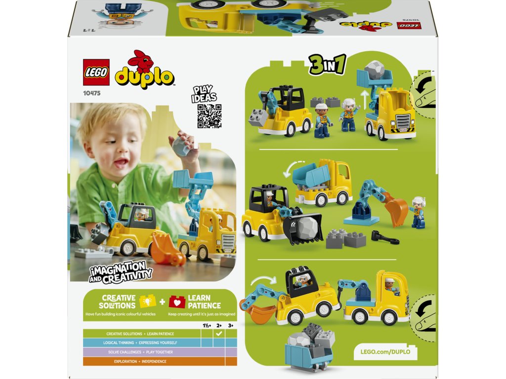 LEGO® Vozidla na stavbě 3 v 1 10475 umožňují dětem postavit hned několik stavebních strojů. Přestavitelné modely, velké dílky a jednoduché sestavení rozvíjejí kreativitu, motoriku a hravou formou seznamují se světem stavby.